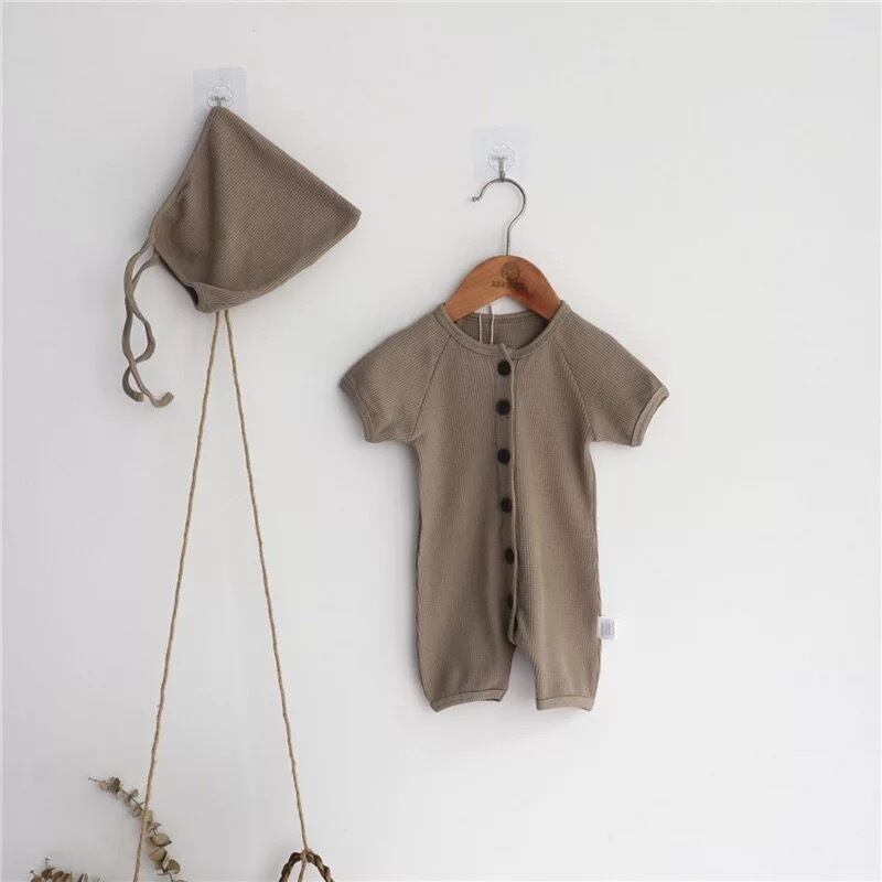 木製ボタンがオシャレなワッフル生地のロンパースです!